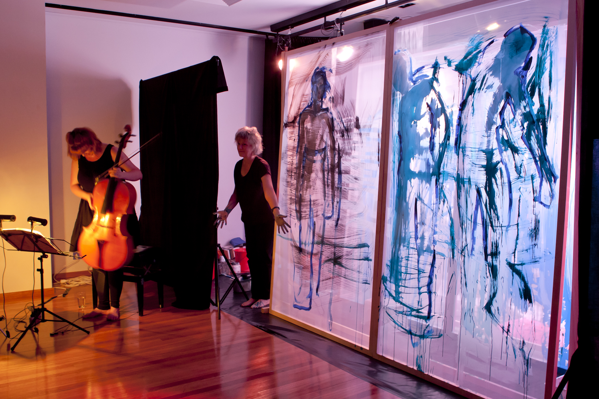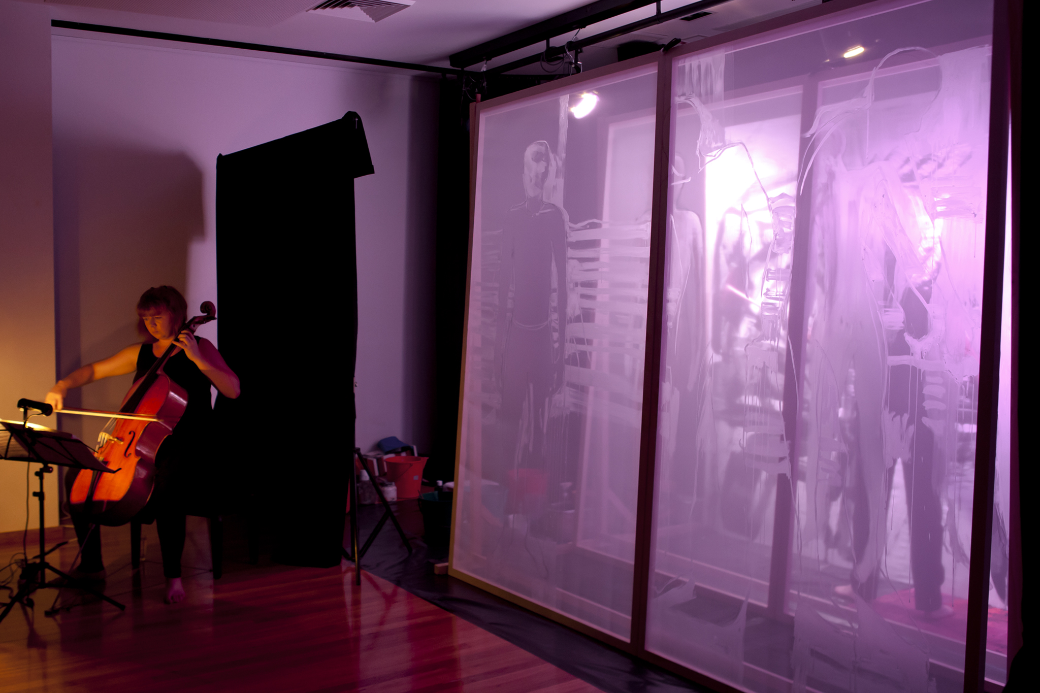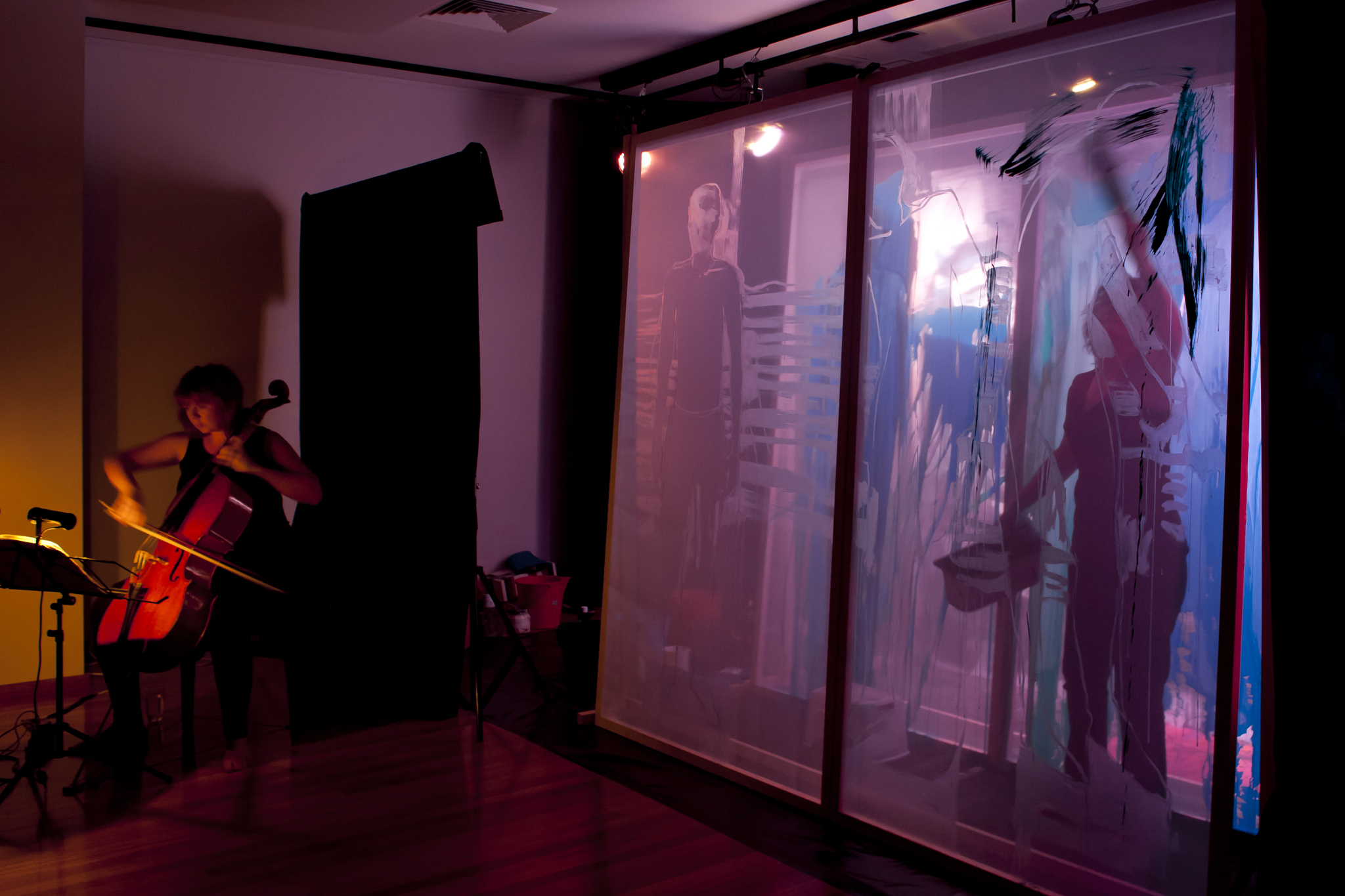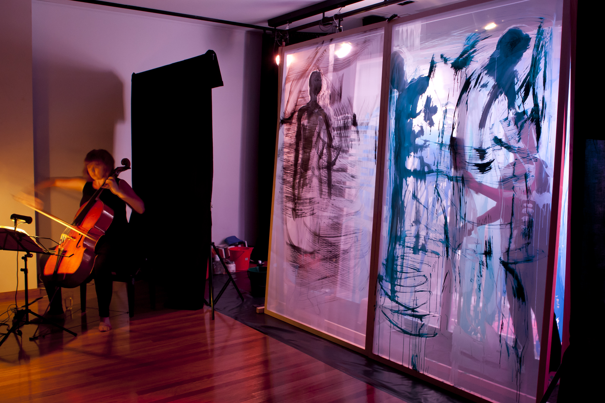 Using three rows of translucent stretchers each 2.3 x 2.7metres, Judith painted her visual response to J.S.Bach's Cello Suite No.5 in Cm played by cellist Rachel Scott. The performance of 6 movements, at The Italian Forum Cultural Centre in Leichhardt on 15th November 2013, took 45 minutes to perform.