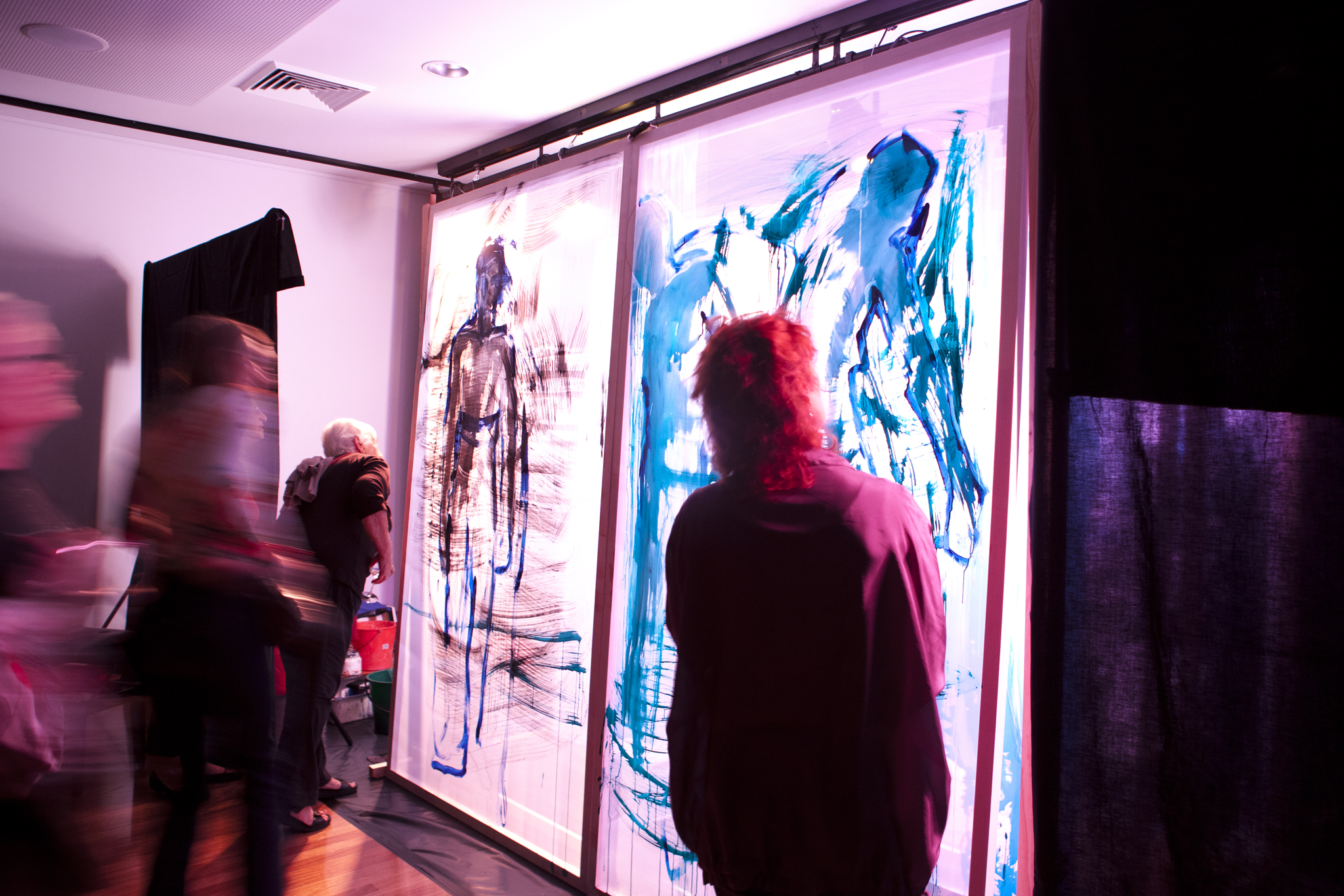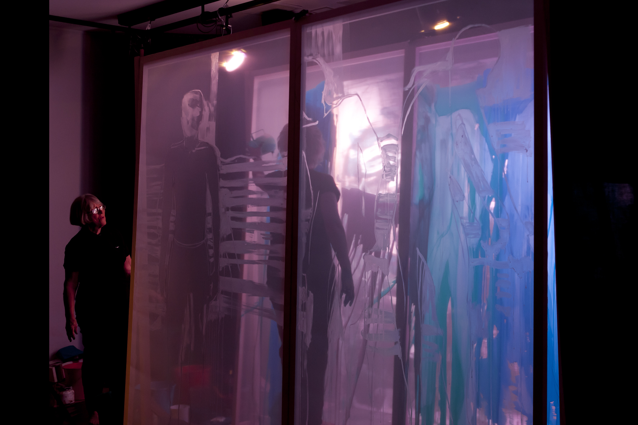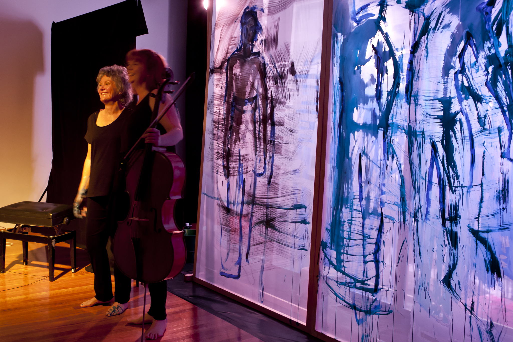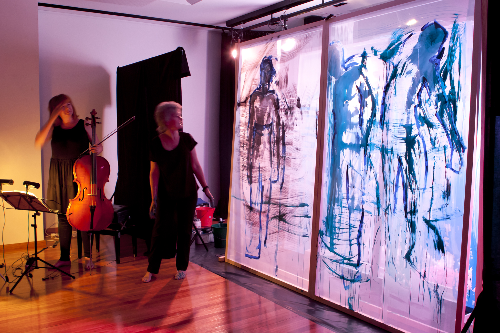 Using three rows of translucent stretchers each 2.3 x 2.7metres, Judith painted her visual response to J.S.Bach's Cello Suite No.5 in Cm played by cellist Rachel Scott. The performance of 6 movements, at The Italian Forum Cultural Centre in Leichhardt on 15th November 2013, took 45 minutes to perform.