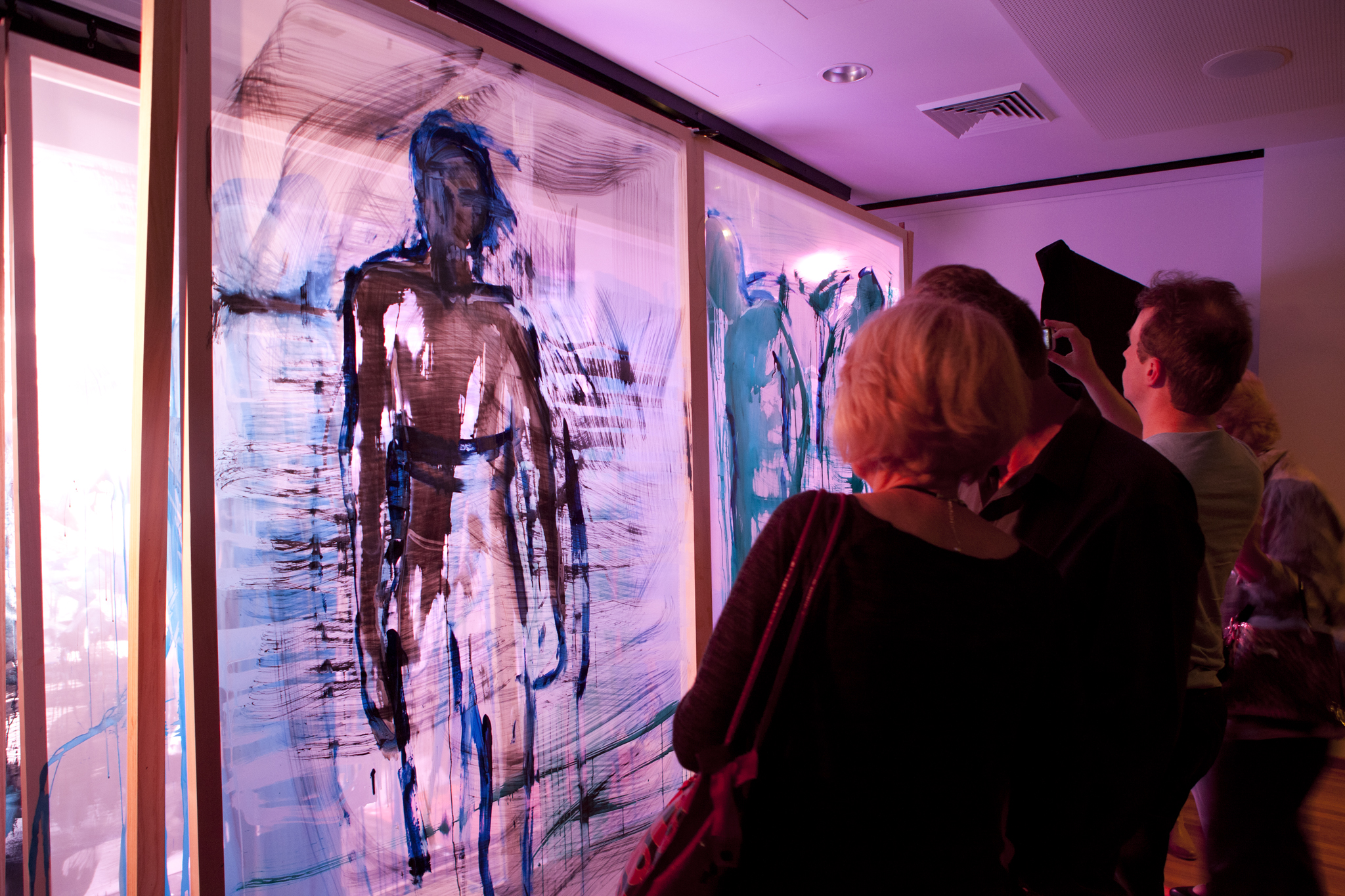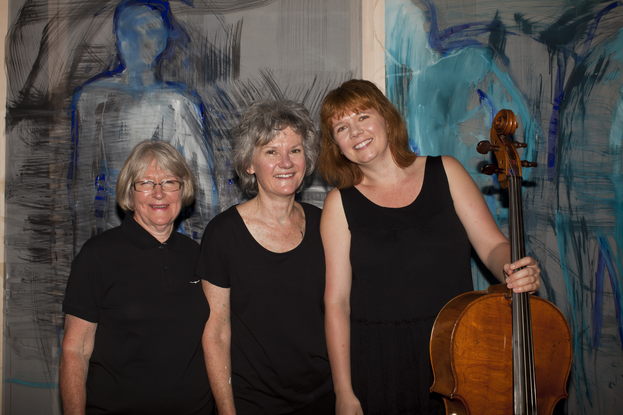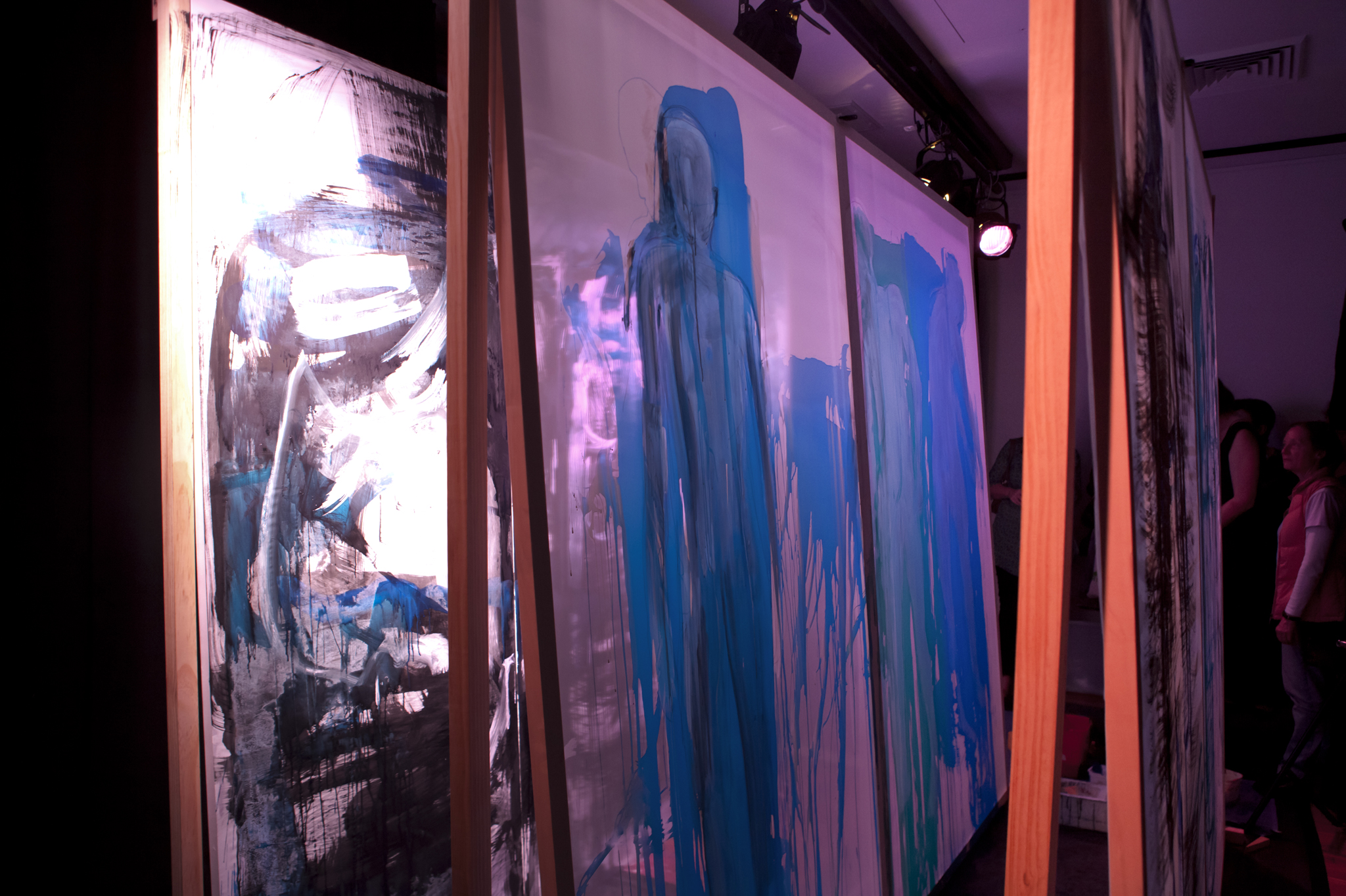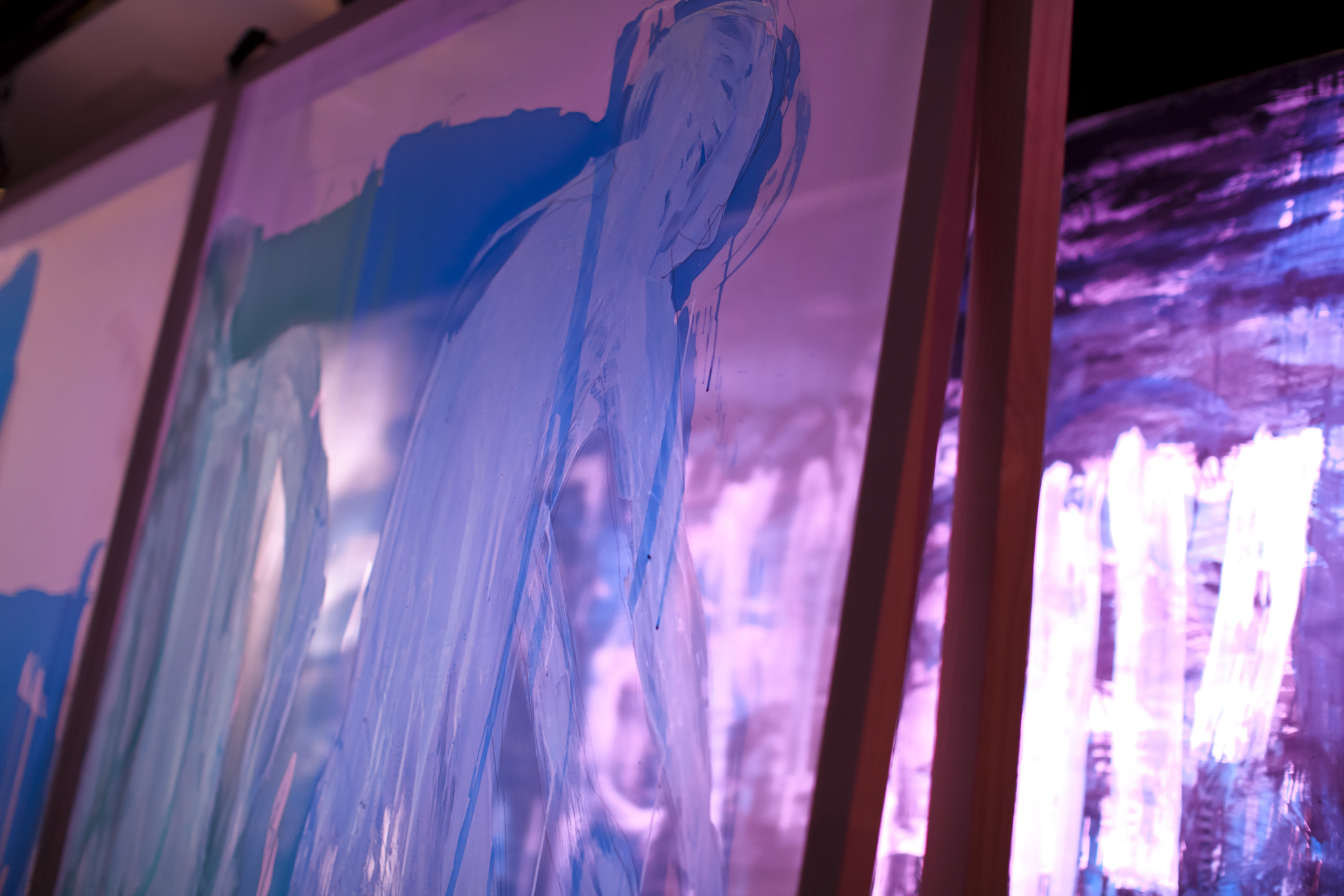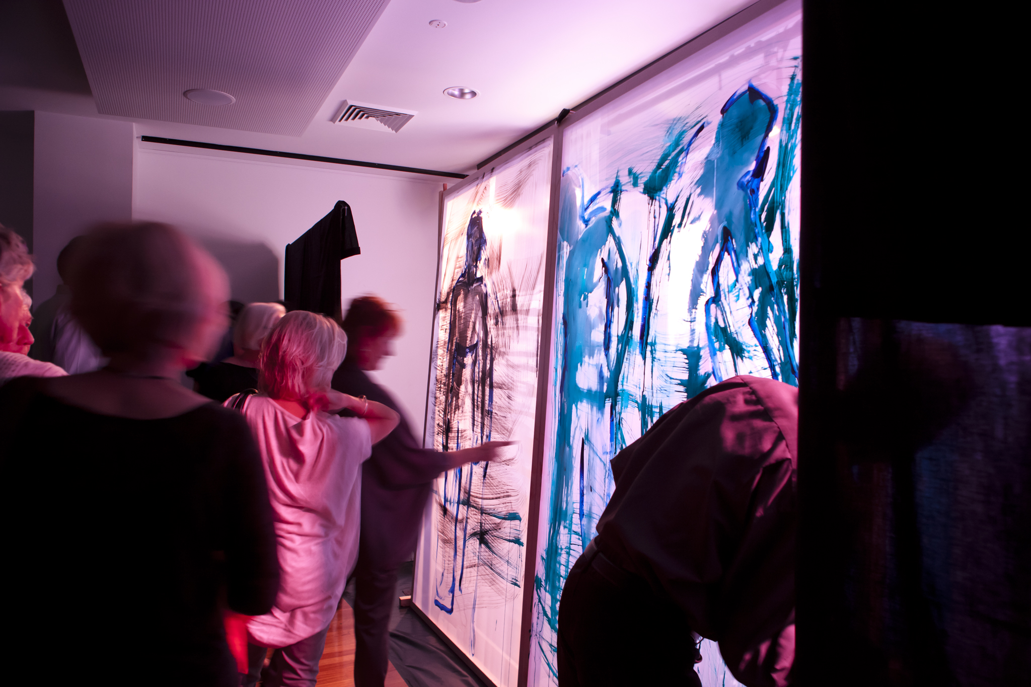 Using three rows of translucent stretchers each 2.3 x 2.7metres, Judith painted her visual response to J.S.Bach's Cello Suite No.5 in Cm played by cellist Rachel Scott. The performance of 6 movements, at The Italian Forum Cultural Centre in Leichhardt on 15th November 2013, took 45 minutes to perform.