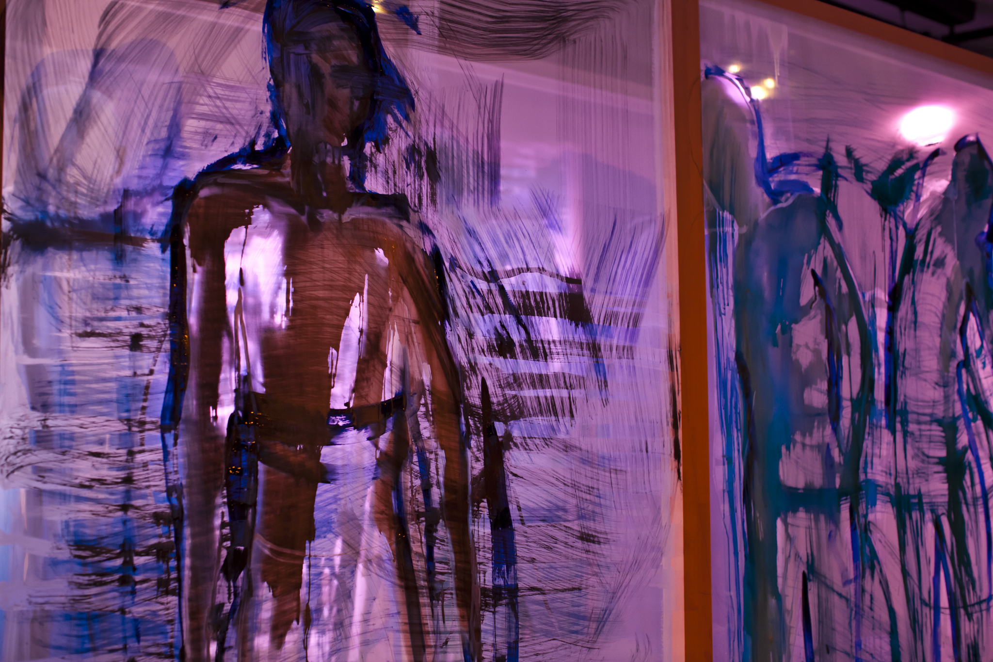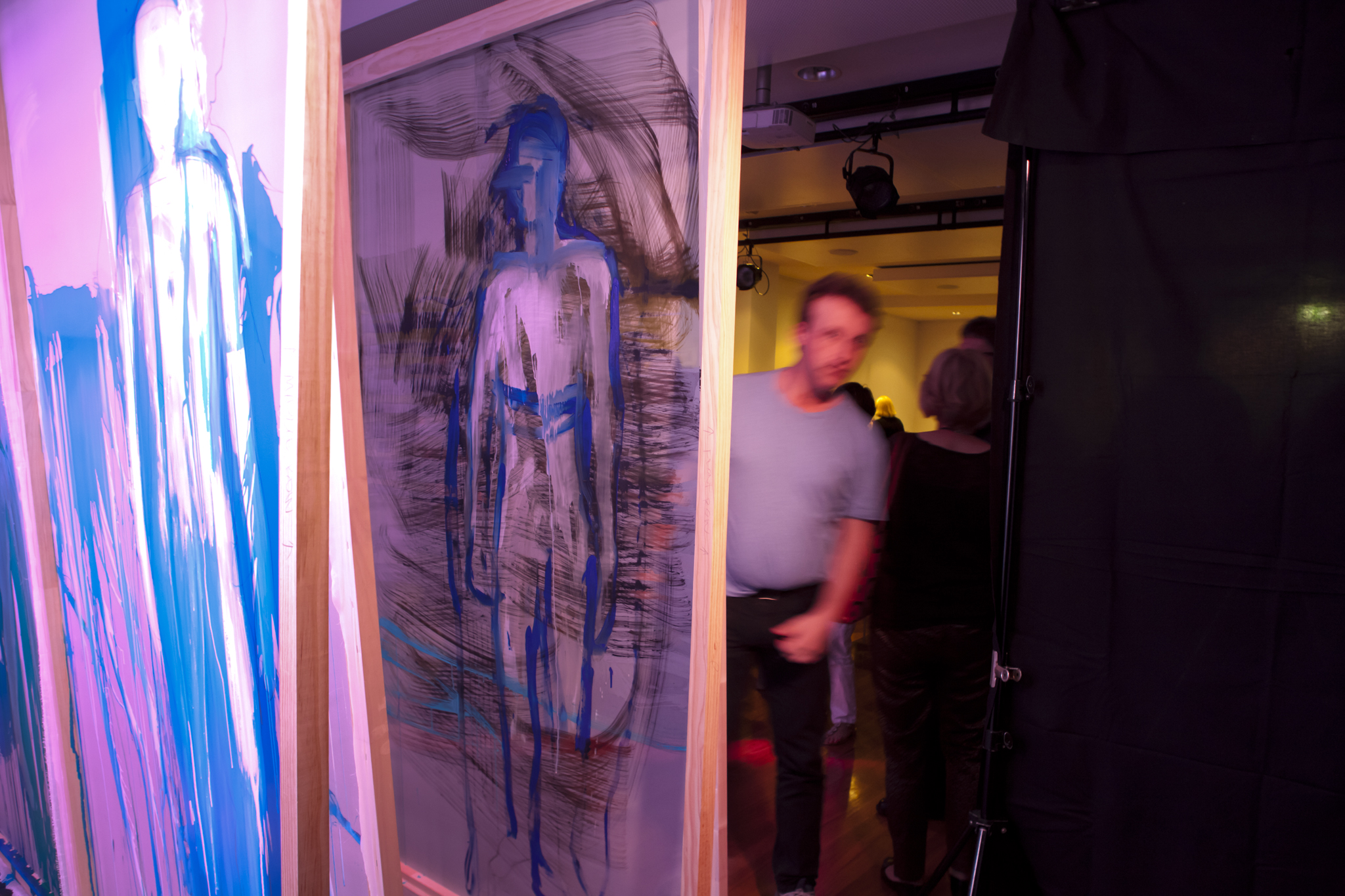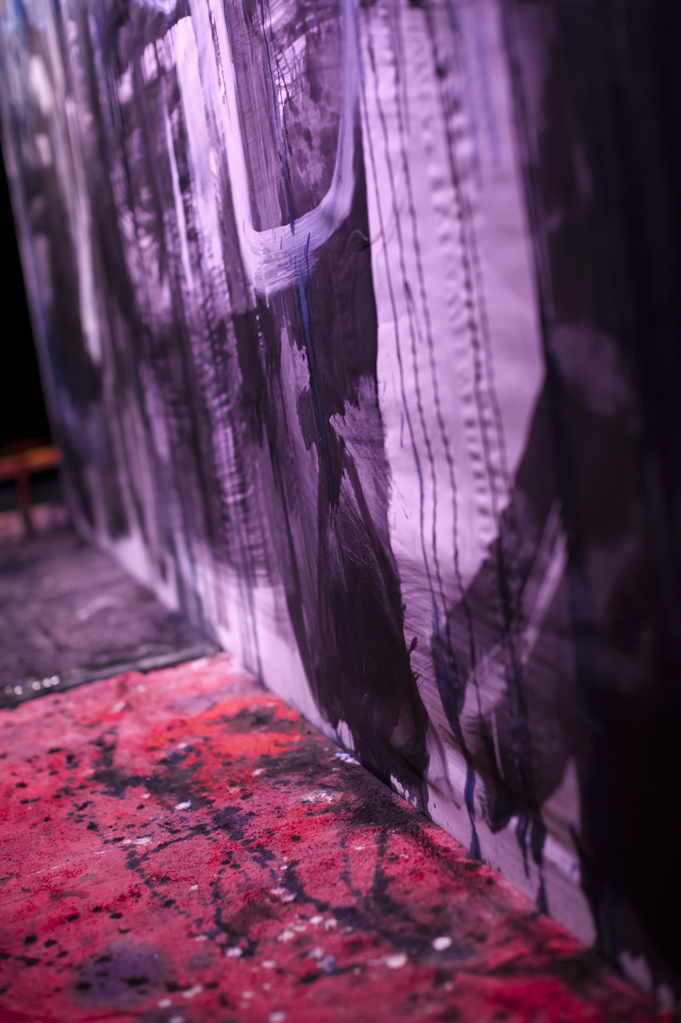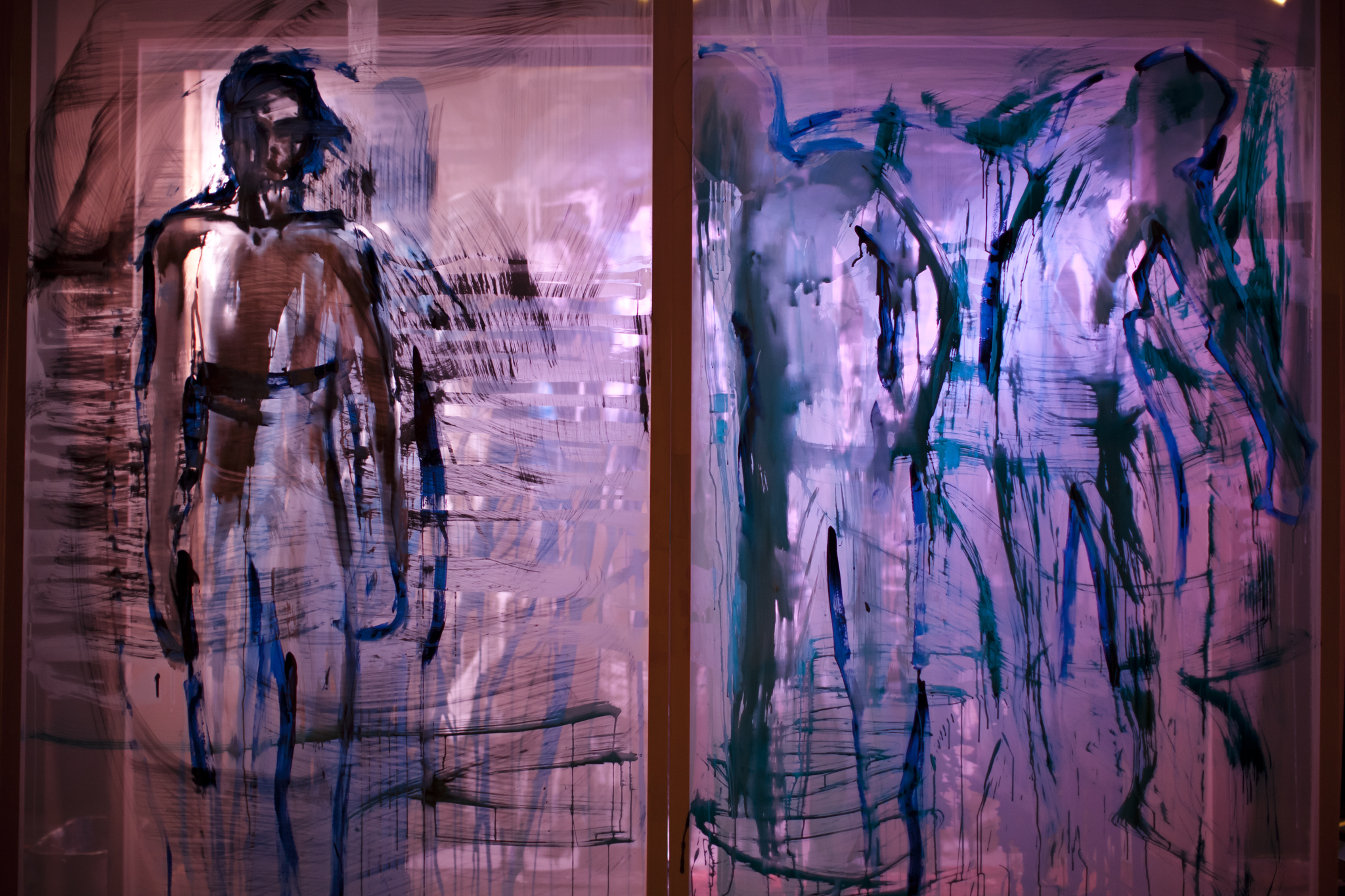 Using three rows of translucent stretchers each 2.3 x 2.7metres, Judith painted her visual response to J.S.Bach's Cello Suite No.5 in Cm played by cellist Rachel Scott. The performance of 6 movements, at The Italian Forum Cultural Centre in Leichhardt on 15th November 2013, took 45 minutes to perform.