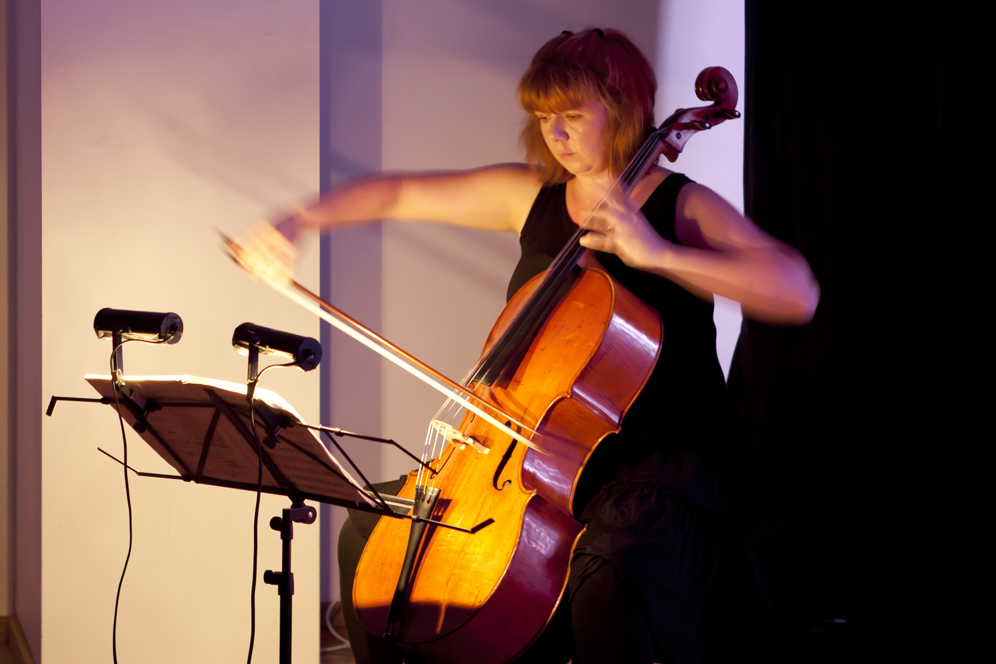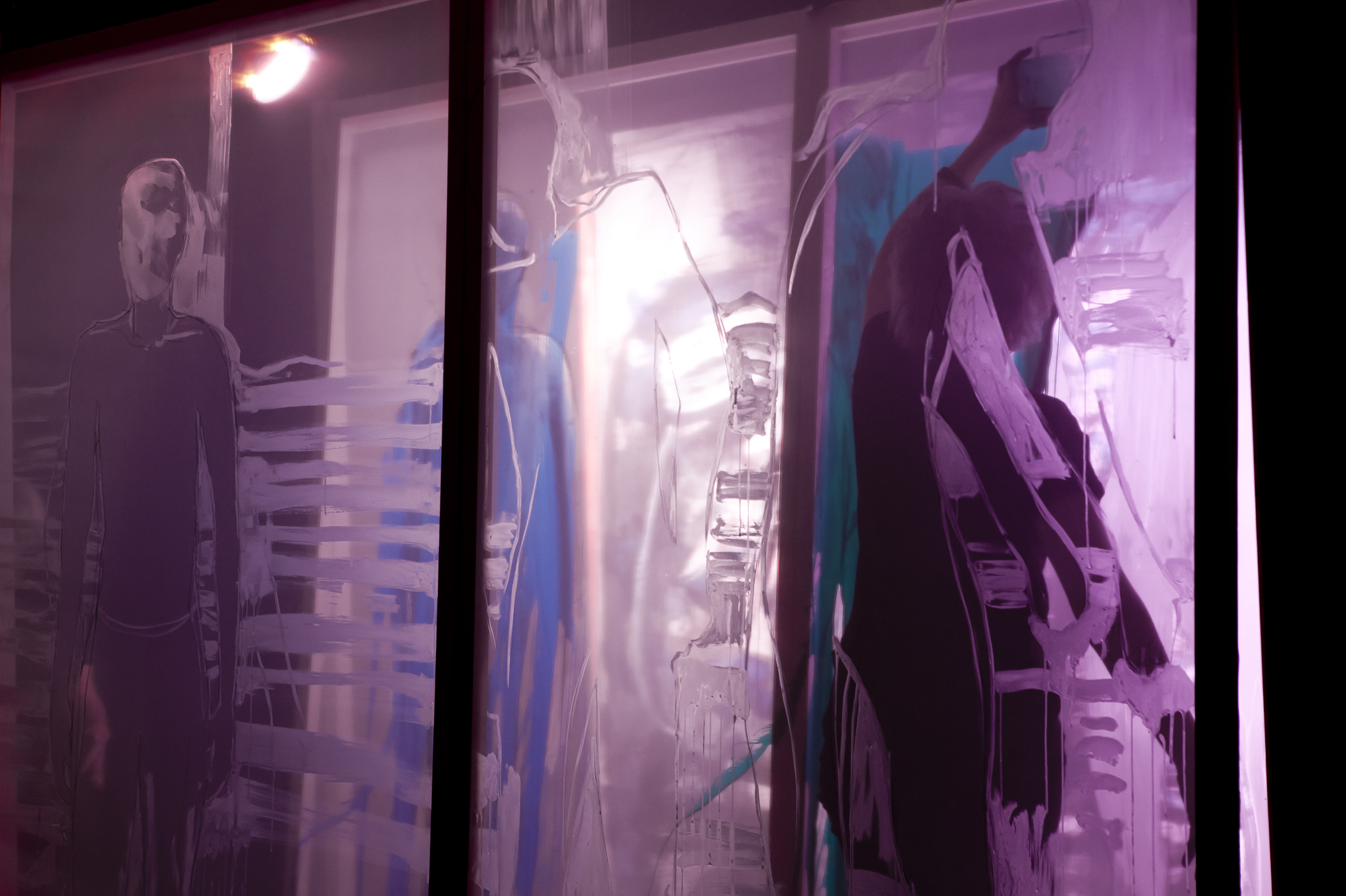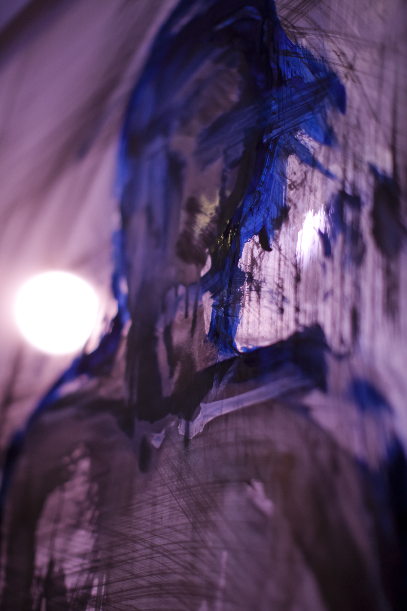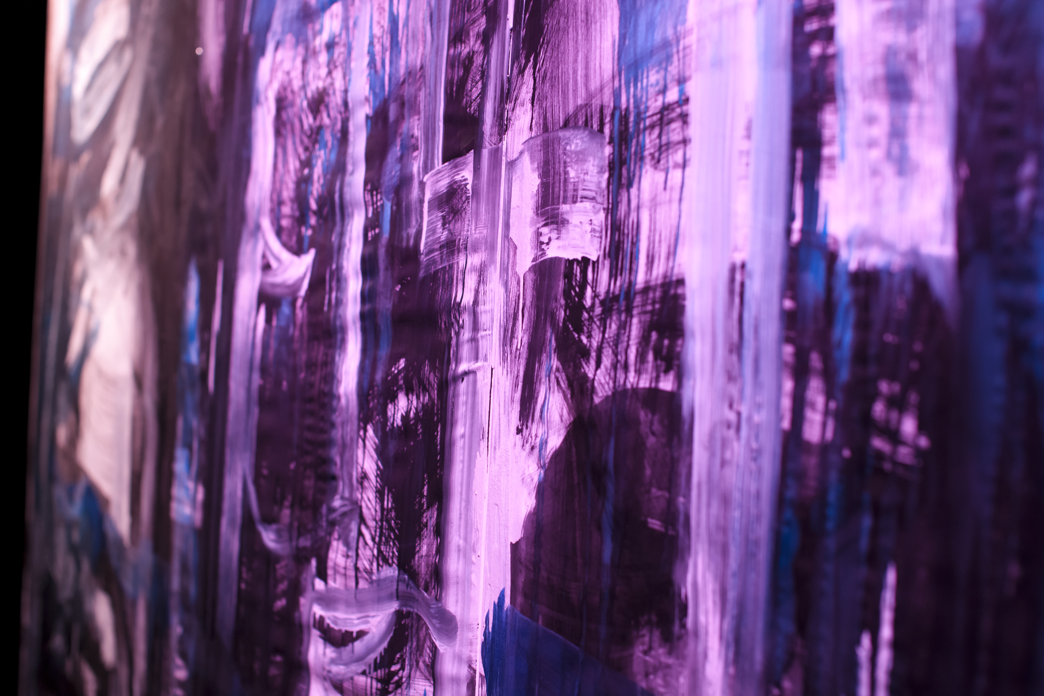 Using three rows of translucent stretchers each 2.3 x 2.7metres, Judith painted her visual response to J.S.Bach's Cello Suite No.5 in Cm played by cellist Rachel Scott. The performance of 6 movements, at The Italian Forum Cultural Centre in Leichhardt on 15th November 2013, took 45 minutes to perform.