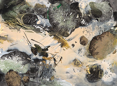 The interplay of water in landscape continues to inspire, and the south coastal area of NSW has been a focus in this new body of work; providing a welcome retreat into a beautiful natural environment In this new series water catches light or is often still. At times, marks left in sand trace the passage of water around rocks. Eroded rocks are suggested in textured shapes. Vertical textured shapes of trees are fragmented, alluding to glimpses of bush. Other landscape elements are re-aligned as abstract shapes. This abstraction of solid landscape form aims to explain the effect of bush, beach, and creek on the senses: sanctuaries teeming with birdcall, light and peace. Beaver Galleries, Canberra |
